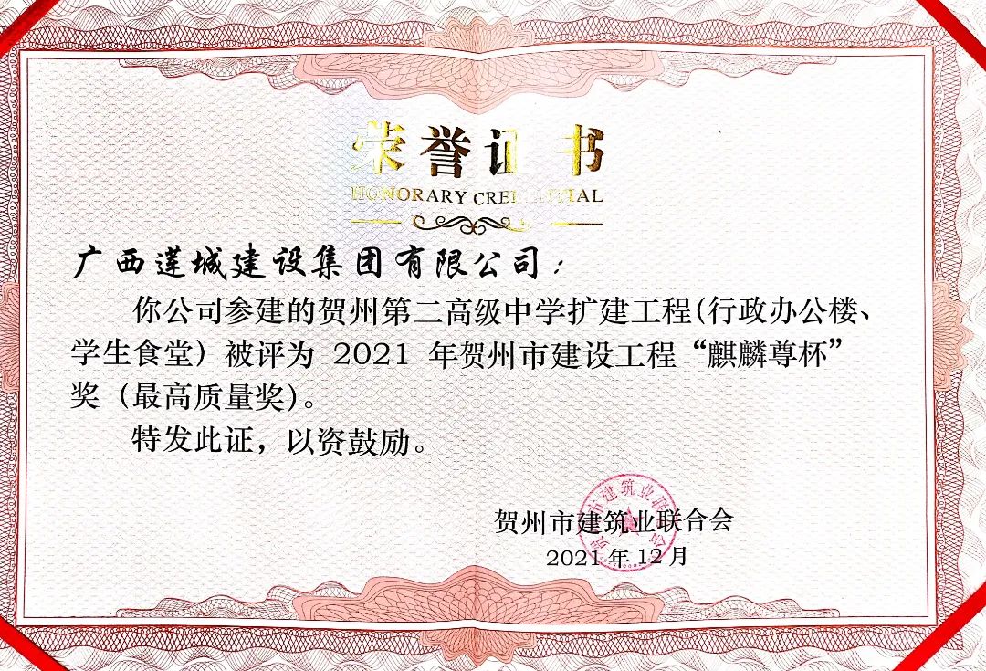 集團(tuán)公司參建的賀州第二高級中學(xué)擴(kuò)建工程(行政辦公樓、學(xué)生食堂)項(xiàng)目榮獲2021年賀州市建設(shè)工程“麒麟尊杯”獎(最高質(zhì)量獎)。