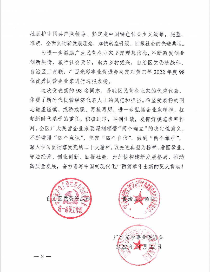 為進一步激勵廣大民營企業(yè)家堅定理想信念,不斷激發(fā)創(chuàng)業(yè)創(chuàng)新熱情,履行社會責任,助力鄉(xiāng)村振興,11月22日,自治區(qū)黨委統(tǒng)戰(zhàn)部、自治區(qū)工商聯(lián)、廣西光彩事業(yè)促進會對2022年度98位優(yōu)秀民營企業(yè)家進行通報表揚。廣西蓮城建設集團有限公司總經(jīng)理陳夢華獲評為2022年度廣西優(yōu)秀民營企業(yè)家。