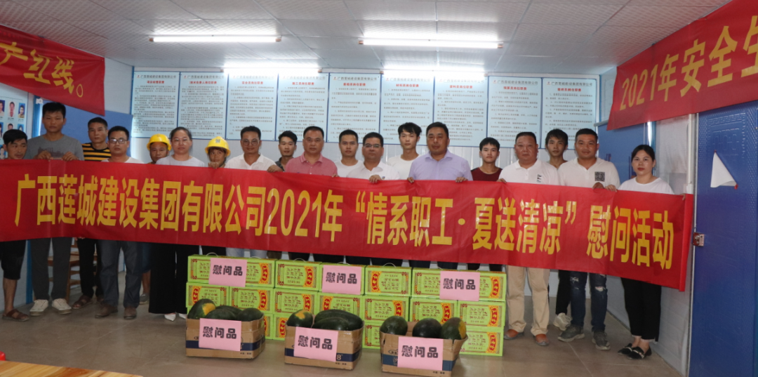 為切實做好夏季防暑降溫工作,關(guān)心和維護職工身心健康,8月25日下午,集團公司副總經(jīng)理、總工程師姜紅華,總經(jīng)理助理、經(jīng)營處處長謝喬勇等一行6人前往港南區(qū)婦幼保健院項目、順祥府項目、貴港市西江產(chǎn)業(yè)園科創(chuàng)產(chǎn)業(yè)基地開展“情系職工 夏送清涼”慰問活動,對在酷暑難耐的炎熱天氣中仍堅守工作崗位的項目基層職工進行慰問,并送上王老吉、西瓜等清涼飲品。