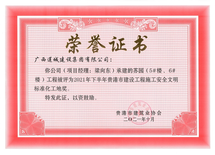 此外,蘇園5#樓6#樓、貴港市西江產(chǎn)業(yè)園科創(chuàng)產(chǎn)業(yè)基地項(xiàng)目設(shè)計(jì)采購(gòu)施工運(yùn)營(yíng)(EPC+0)總承包工程等兩個(gè)項(xiàng)目獲評(píng)“2021年下半年貴港市建設(shè)工程施工安全文明標(biāo)準(zhǔn)化工地獎(jiǎng)”。