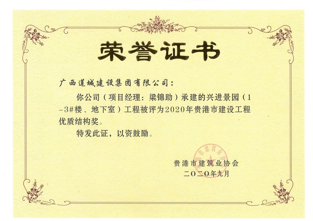 2020年貴港市建設(shè)工程優(yōu)質(zhì)結(jié)構(gòu)獎(jiǎng)興進(jìn)景園(5#、7#)工程,項(xiàng)目經(jīng)理:梁錦助