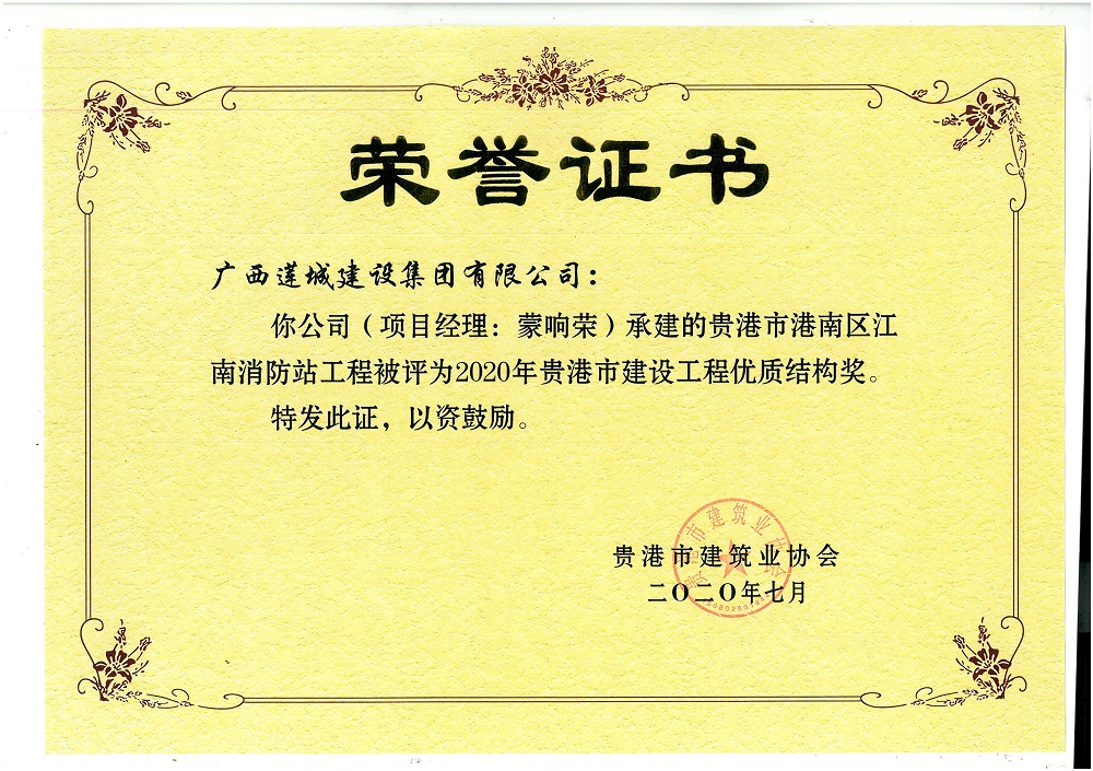 2020年貴港市建設(shè)工程優(yōu)質(zhì)結(jié)構(gòu)獎(jiǎng)貴港市港南區(qū)江南消防站工程,蒙響榮