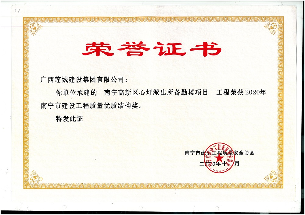 2020年南寧市建設(shè)工程質(zhì)量?jī)?yōu)質(zhì)結(jié)構(gòu)獎(jiǎng)南寧高新區(qū)心圩派出所備勤樓項(xiàng)目