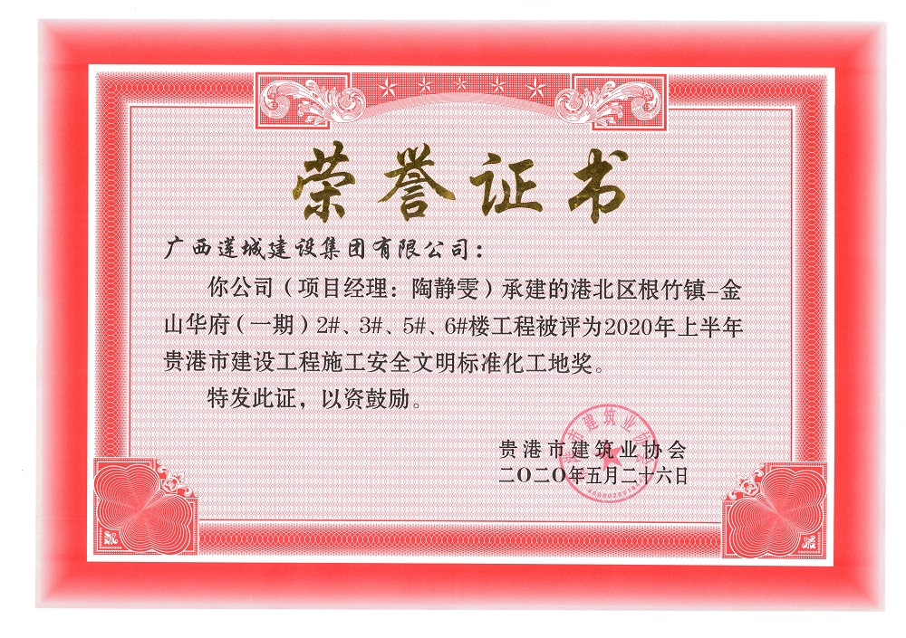 2020年上半年貴港市安全文明工地(市級(jí))港北區(qū)根竹鎮(zhèn)-金山華府(一期)2#、3#、5#、6#樓工程,項(xiàng)目經(jīng)理:陶靜雯