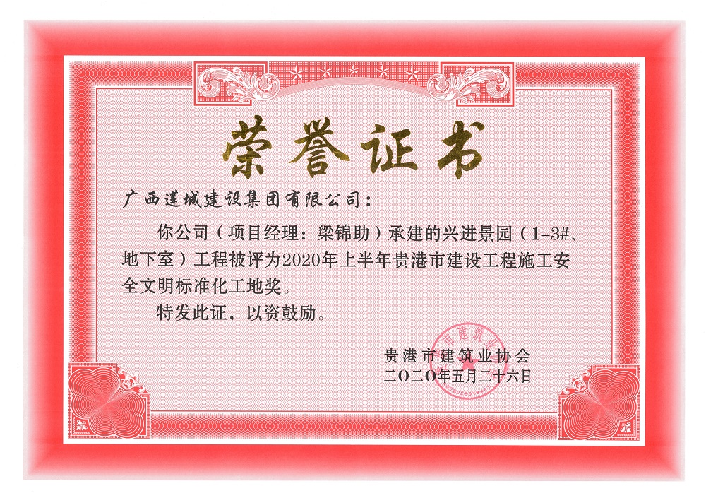 2020年上半年貴港市安全文明工地(市級(jí))興進(jìn)景園(1-3#樓、地下室)工程,項(xiàng)目經(jīng)理:梁錦助