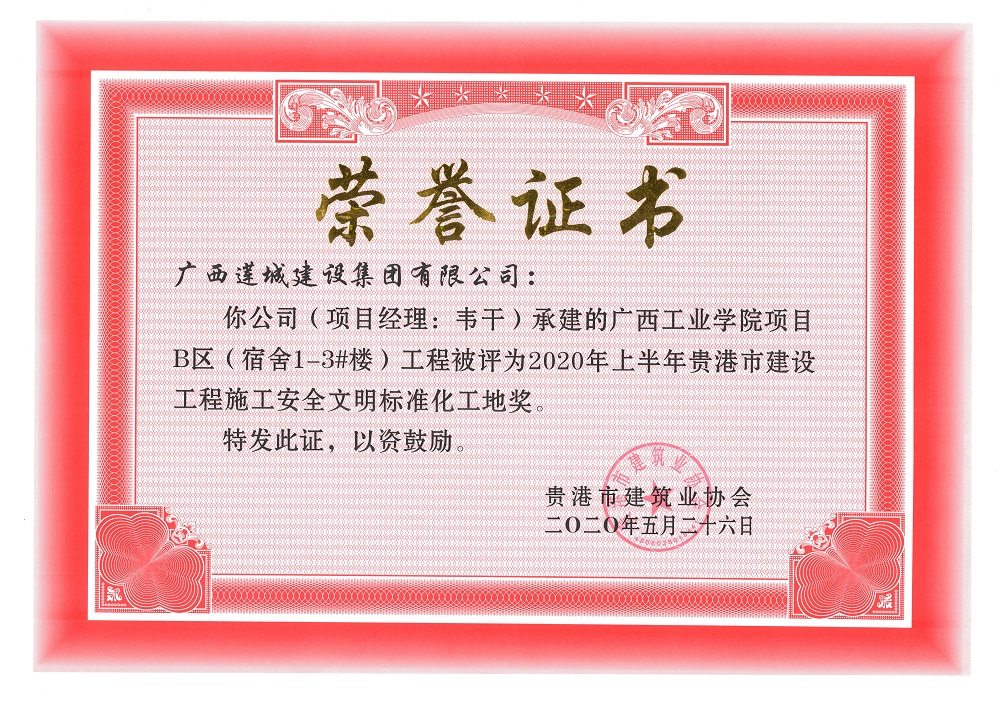 2020年上半年貴港市安全文明工地(市級(jí))廣西工業(yè)學(xué)院項(xiàng)目B區(qū)(宿舍1-3#樓)工程,項(xiàng)目經(jīng)理:韋干