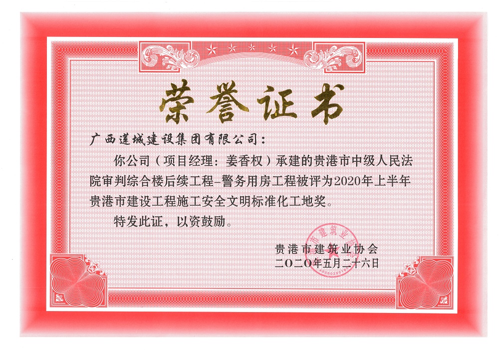 2020年上半年貴港市安全文明工地(市級(jí))貴港市中級(jí)人民法院審判綜合樓后續(xù)工程-警務(wù)用房工程,項(xiàng)目經(jīng)理:姜香權(quán)