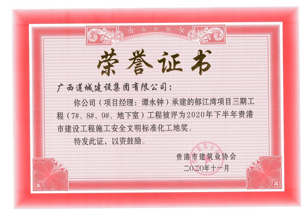 2020年下半年貴港市安全文明工地(市級(jí))郁江灣項(xiàng)目三期工程(7#、8#、9#、地下室),項(xiàng)目經(jīng)理:譚永鐘