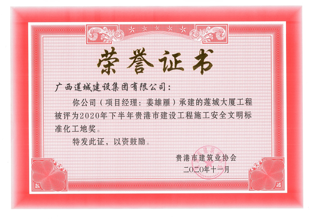 2020年下半年貴港市安全文明工地(市級(jí))蓮城大廈工程,項(xiàng)目經(jīng)理:姜雄雁,