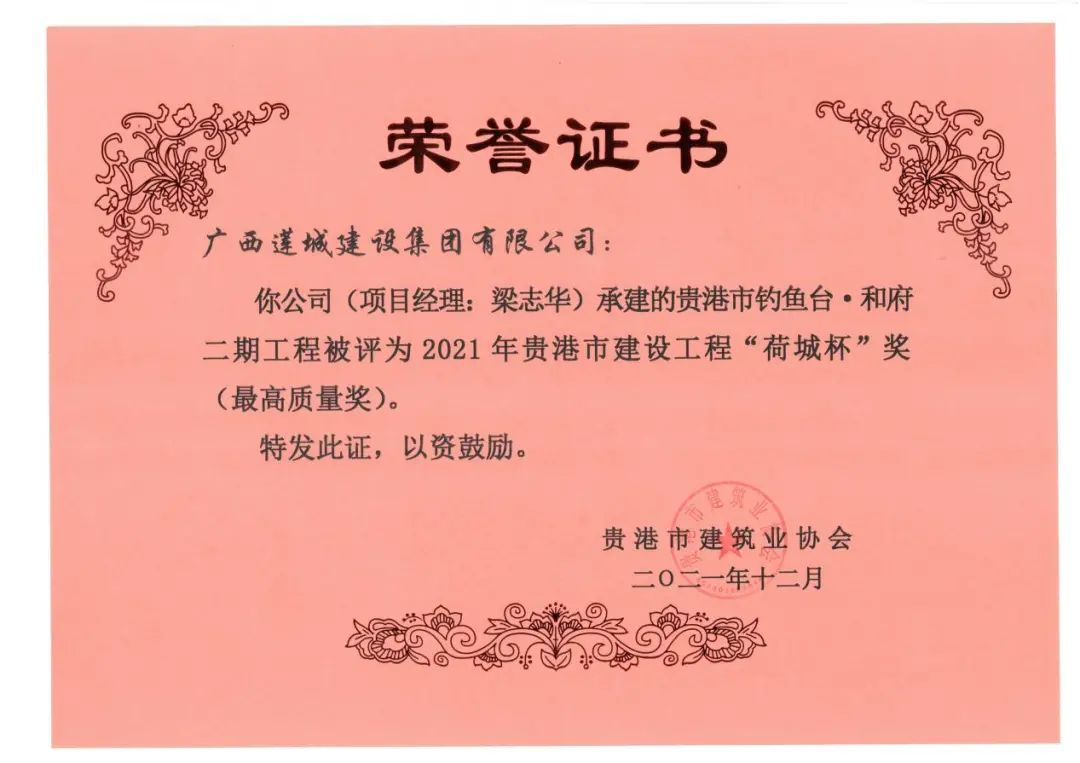 經(jīng)貴港市建筑業(yè)協(xié)會(huì)評(píng)選公示,集團(tuán)公司承建的貴港市釣魚臺(tái)·和府二期工程,貴港市港北區(qū)高級(jí)中學(xué)教學(xué)樓工程,貴港市港南區(qū)江南消防站項(xiàng)目工程,貴港市檢察院辦案和專業(yè)技術(shù)用房、地下訓(xùn)練場(chǎng)工程,貴港市中心血站搬遷重建項(xiàng)目(一期)業(yè)務(wù)樓工程等5個(gè)項(xiàng)目被評(píng)為2021年貴港市建設(shè)工程“荷城杯”獎(jiǎng)(最高質(zhì)量獎(jiǎng))。
